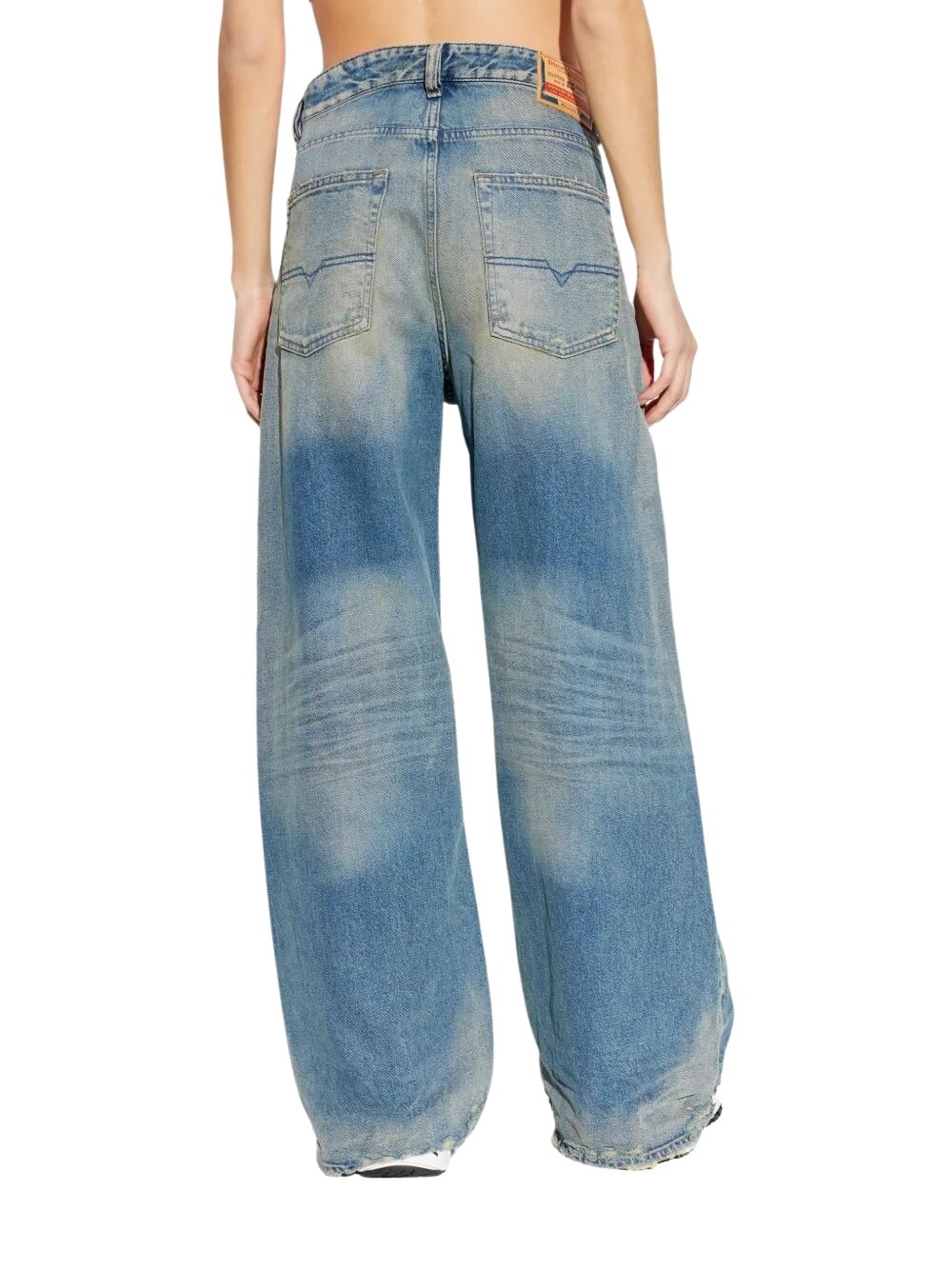 Diesel women`s low-rise jeans with button closure, a low crotch, and an extra-long wide leg. Made from 100% denim with a distressed finish, rips, and abrasions for a destroyed look.