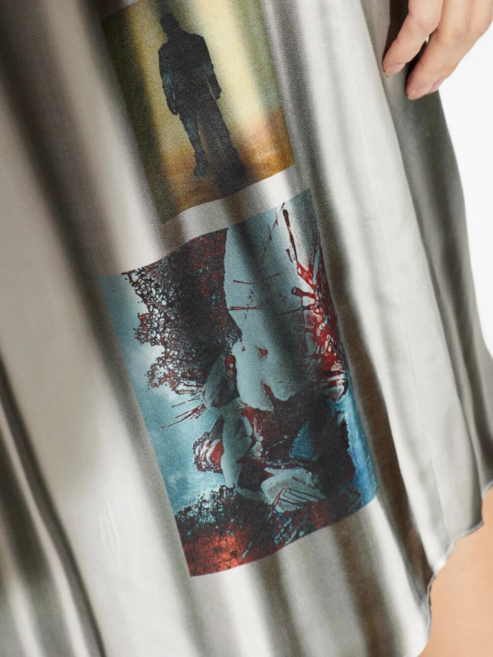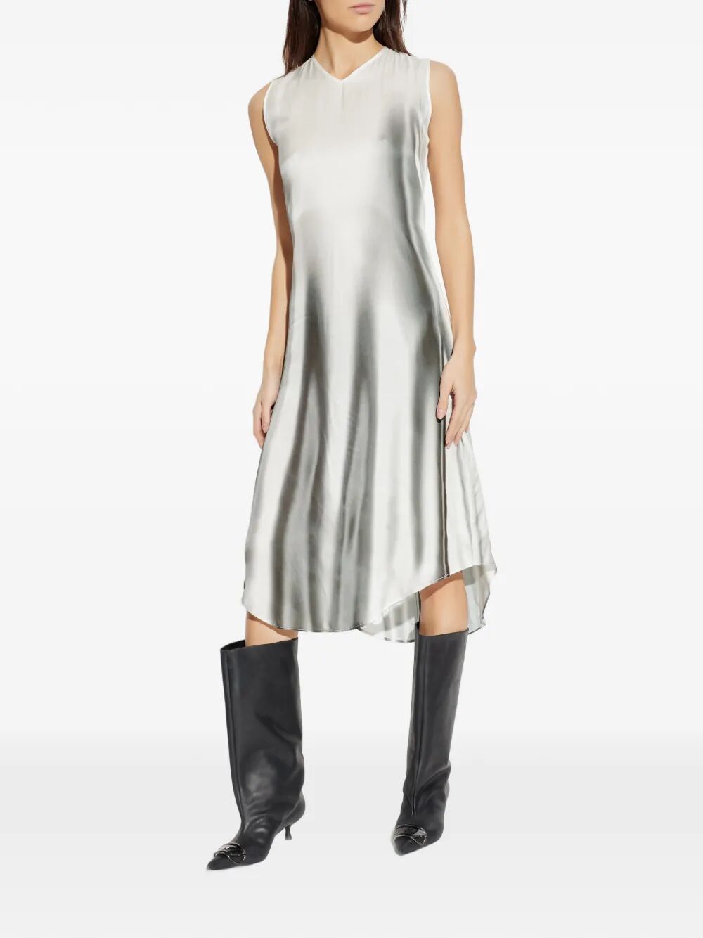 Diesel women`s A-line dress with a rounded hem and slightly elongated back, featuring a multicolored print on the back. Vertical fade effect.