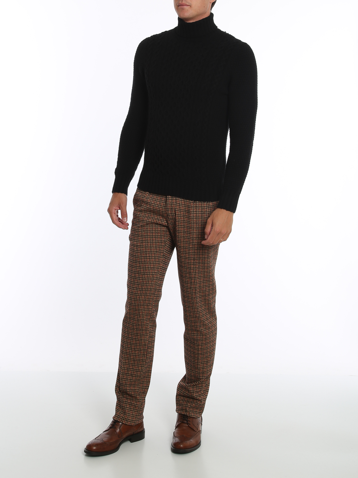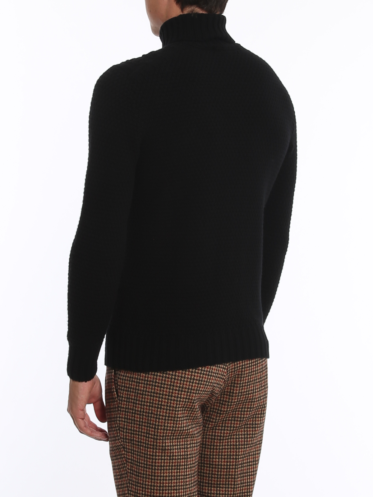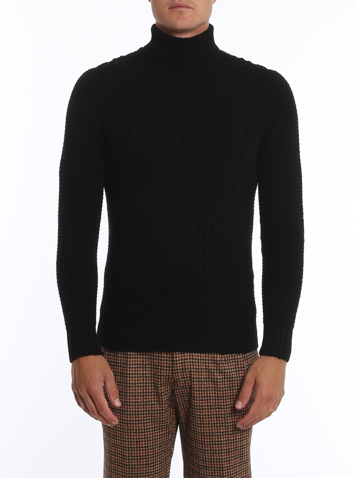 Drumohr Turtleneck in black wool, front braid, ribbed collar and cuffs.