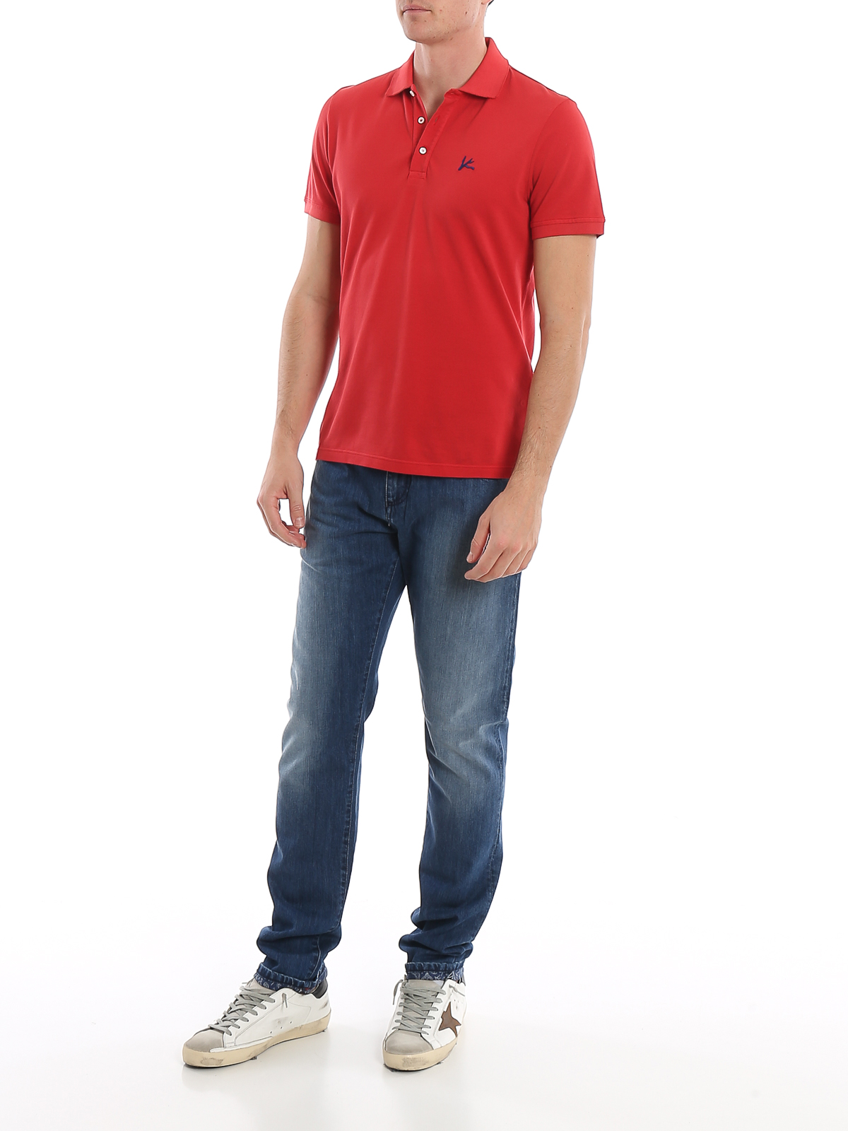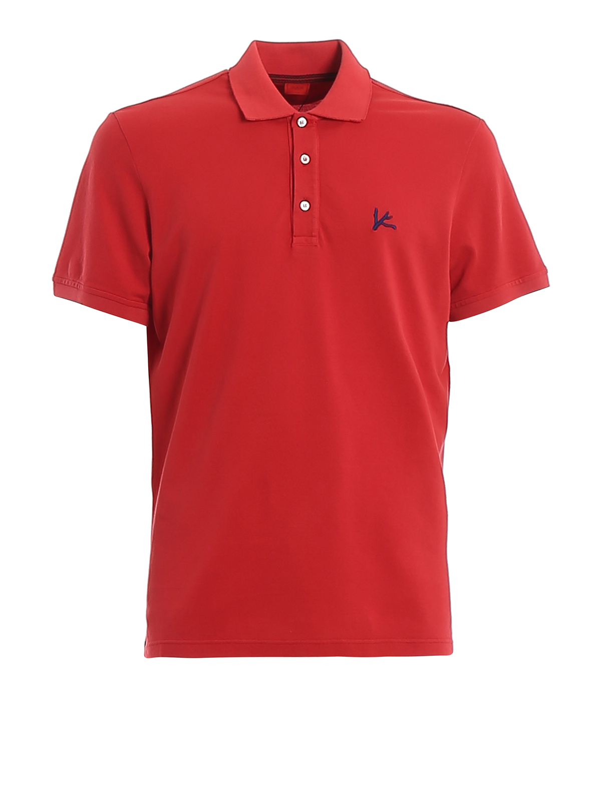 Isaia red cotton polo shirt, ribbed collar with contrasting lining, three button placket, short sleeves, side slits with contrasting logo binding