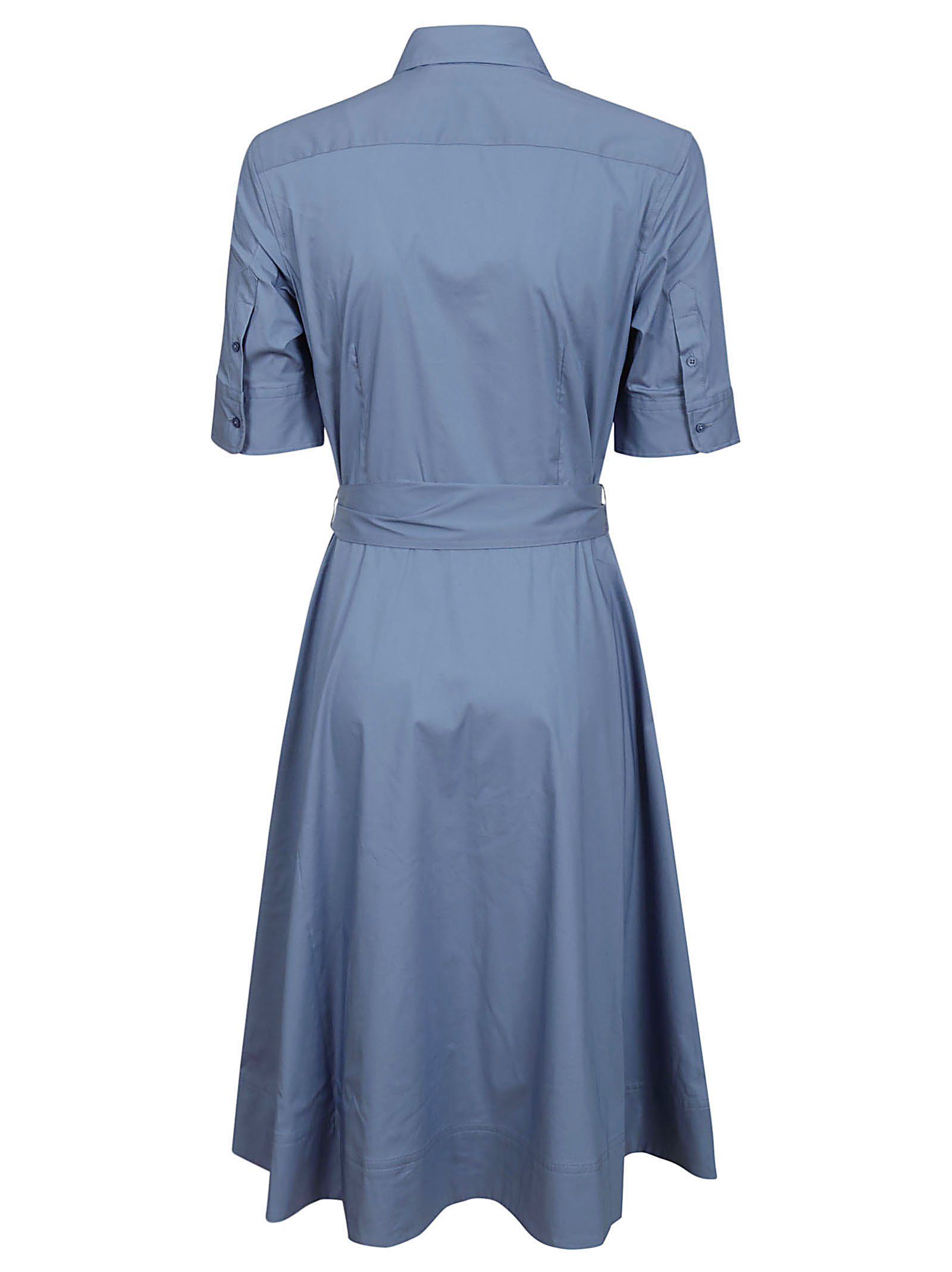 LAUREN RALPH LAUREN long blue dress, with a wide skirt, belt, and button closure. Great for a fresh, light, and summer look.