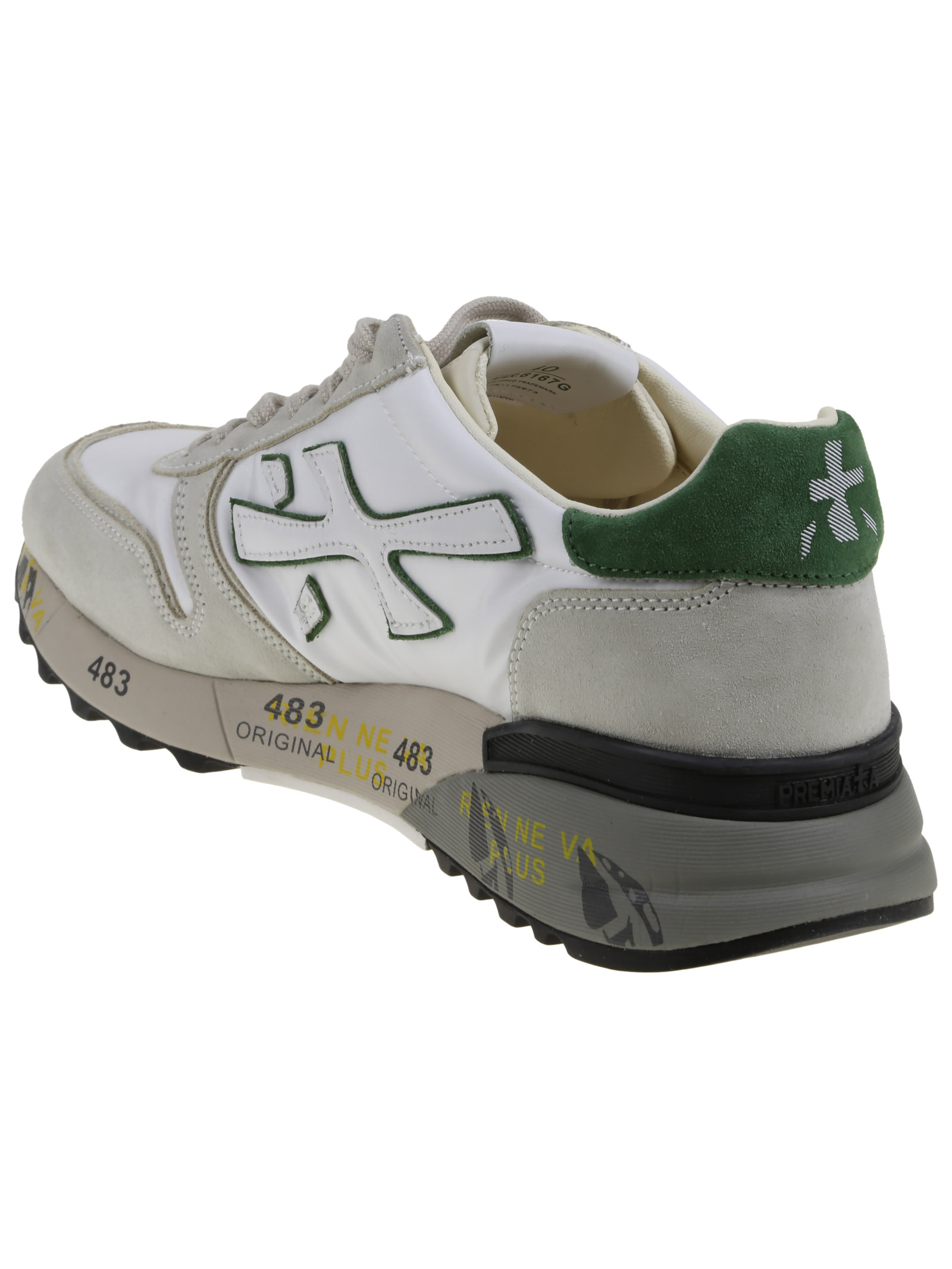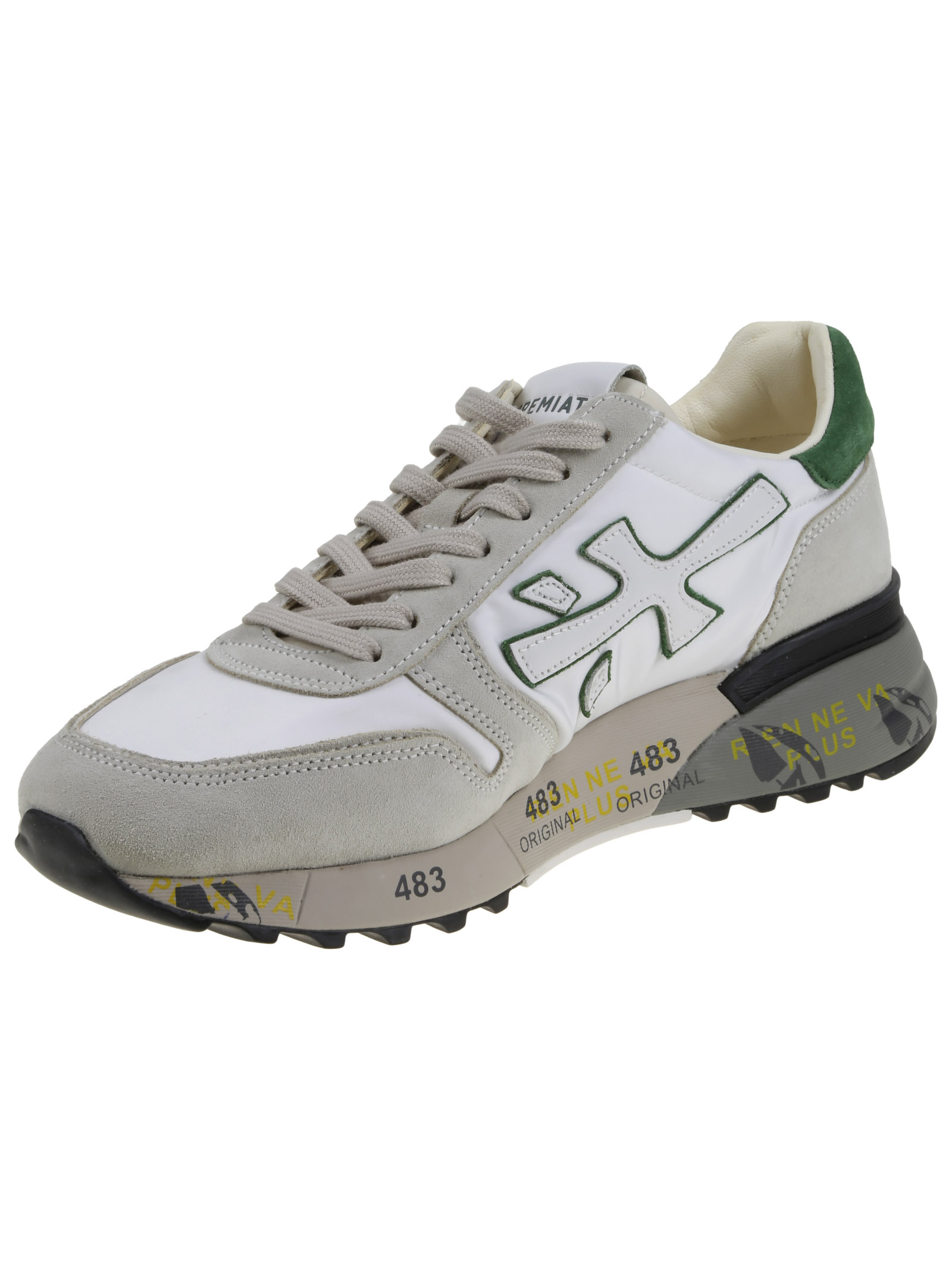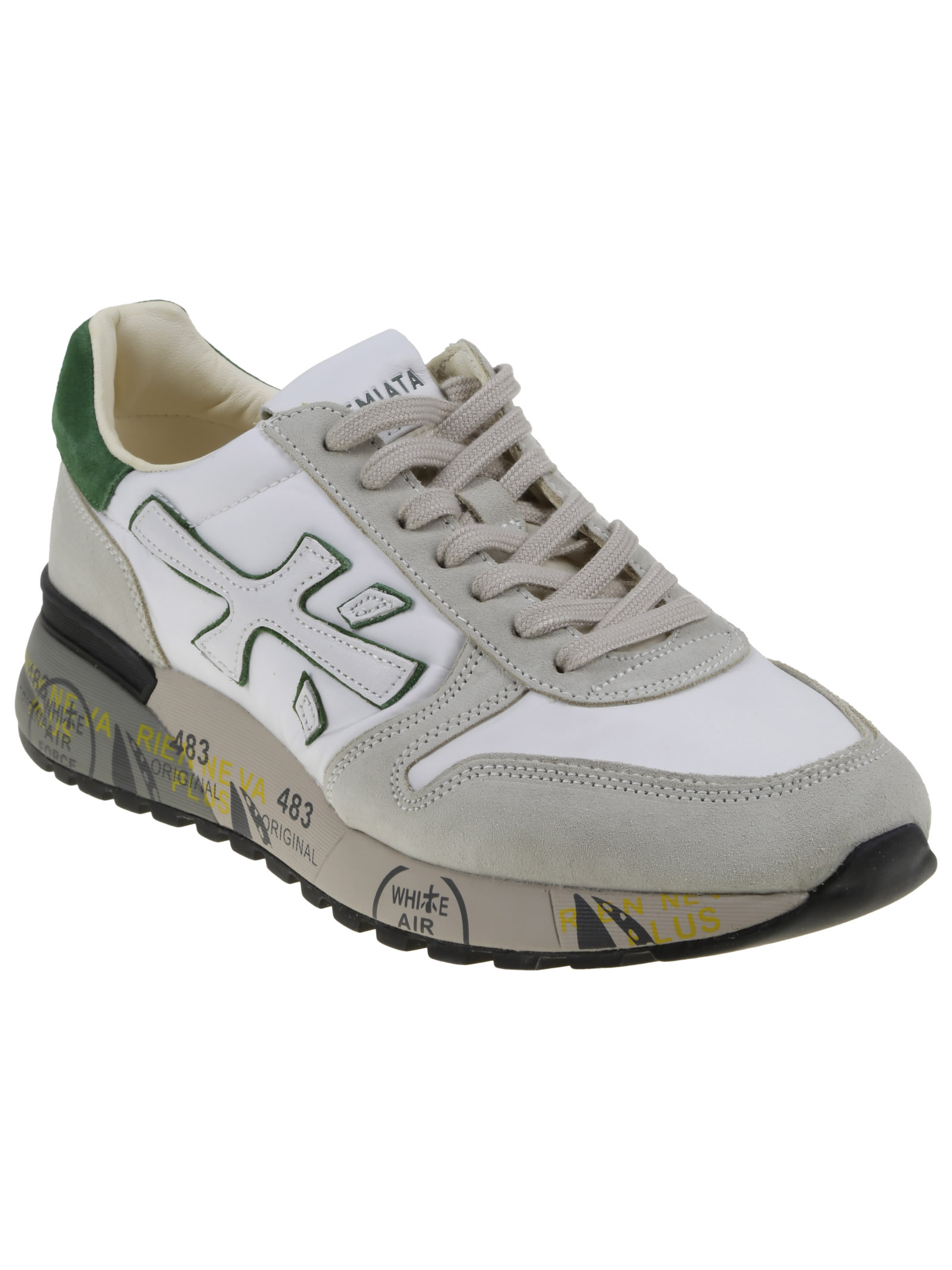 Premiata sneakers in white nylon and grey suede, green and white inserts, rubber sole with print detail, side logo detail.