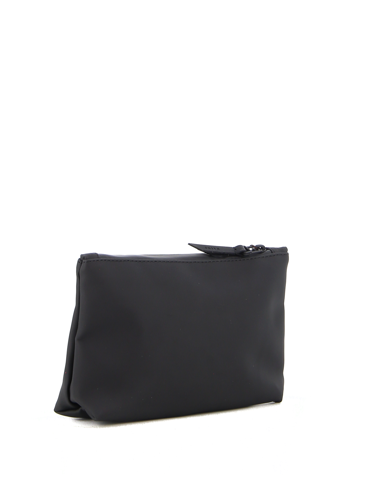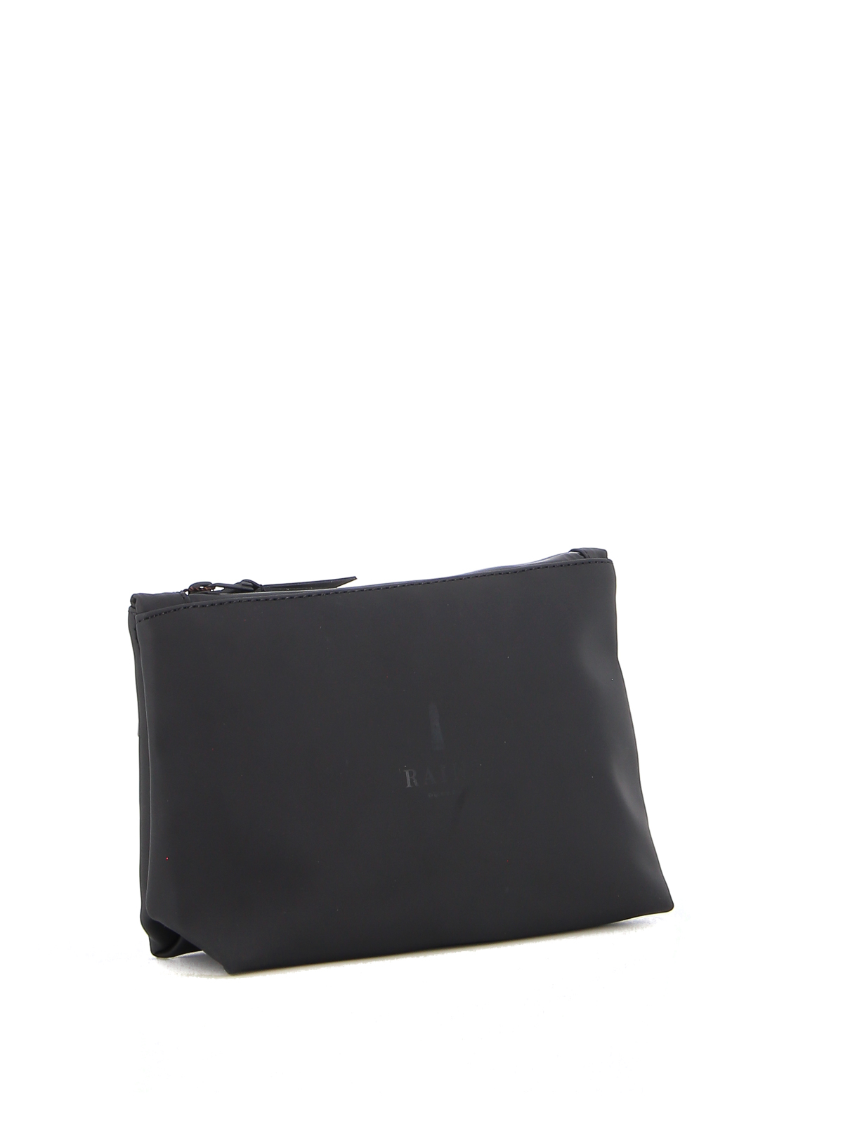 Rains black beauty case, heat-sealed zip closure, logo detail.