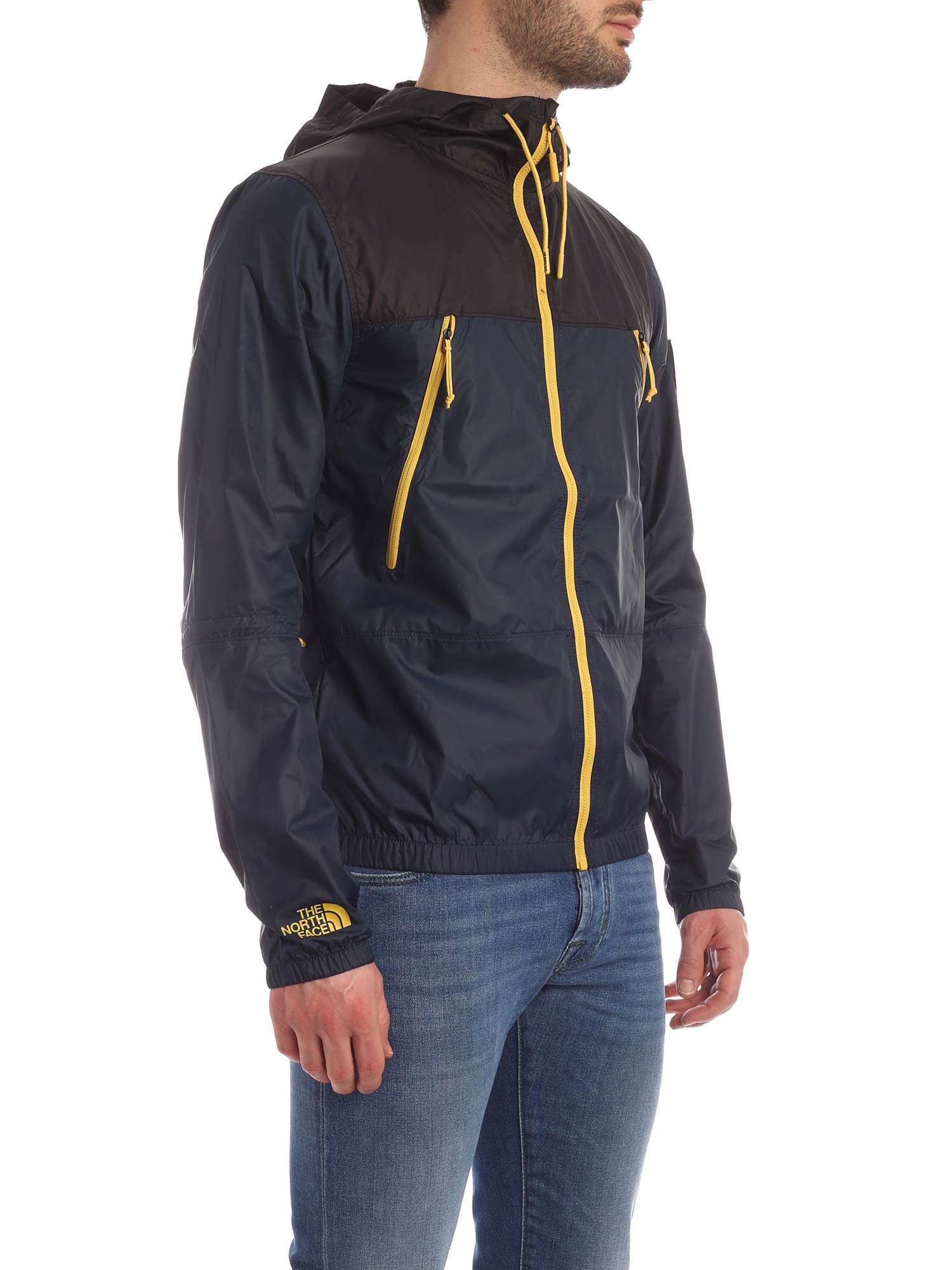 The North Face jacket in blue technical fabric, hood with drawstring, elastic waist and cuffs, side pockets and yellow zip closure.