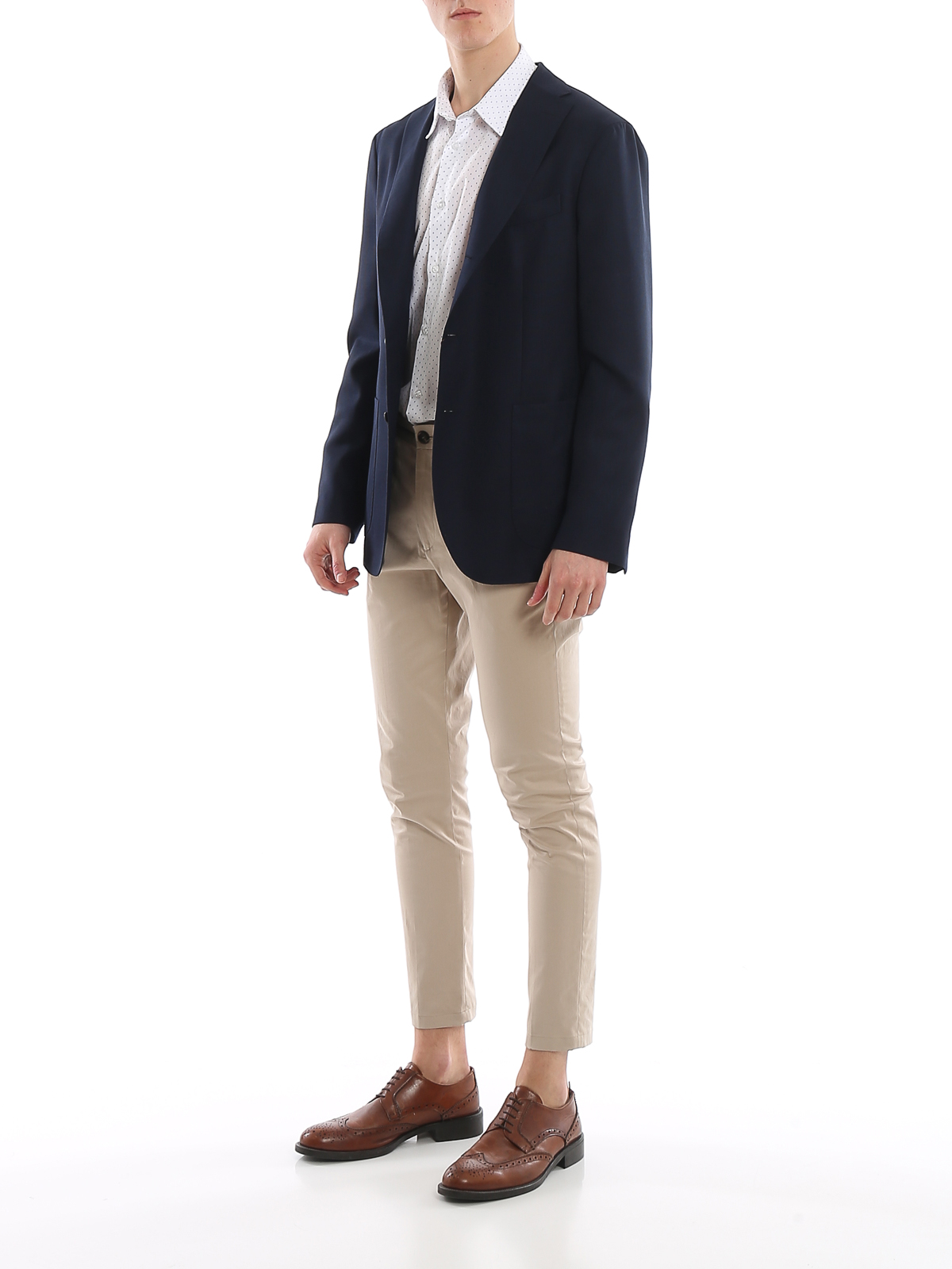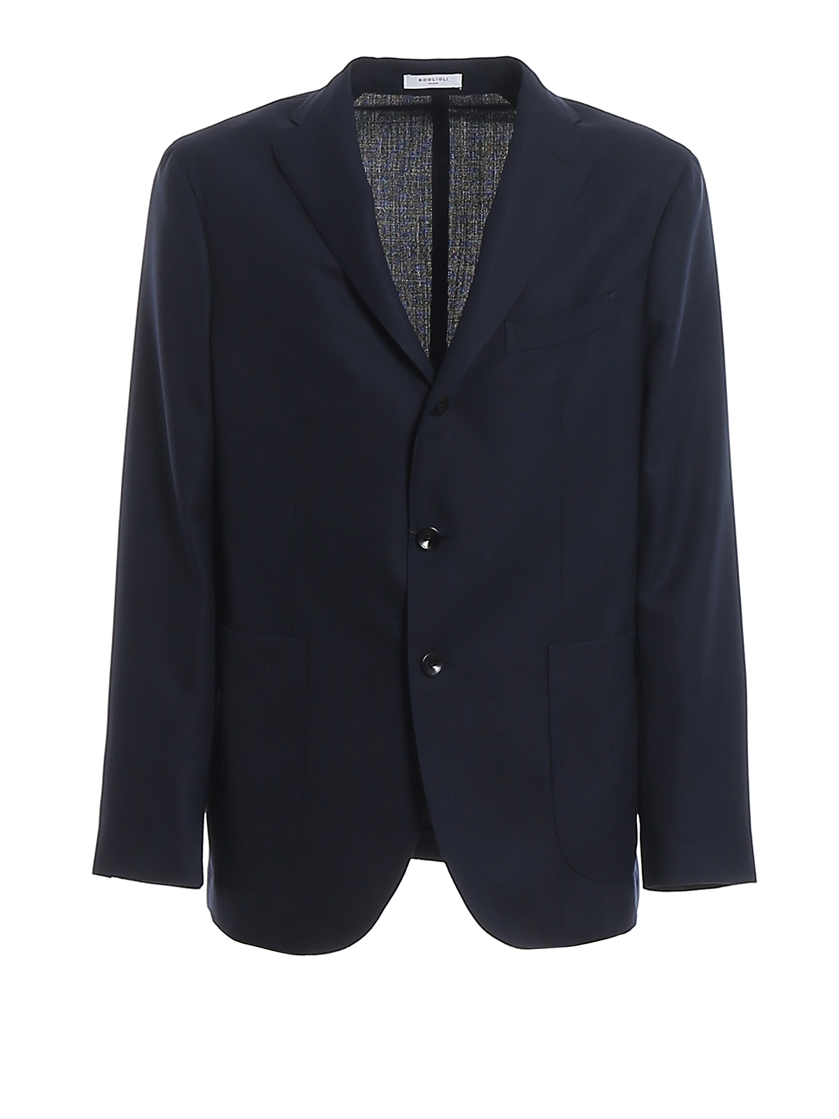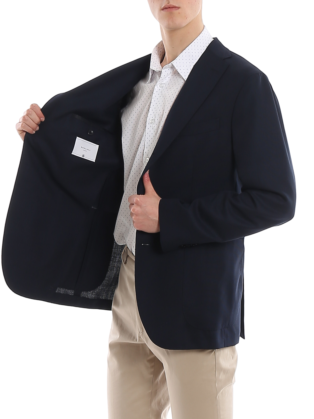 Giacca Boglioli realizzata in fresco lana sfoderata, modello monopetto con tre bottoni stirato a due, completamente decostruito e sfoderato, con spacchi laterali e tasche a toppa.Vestibilità asciutta.