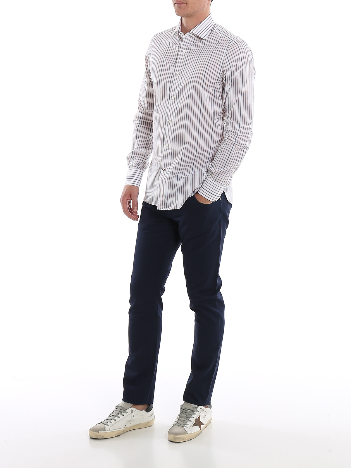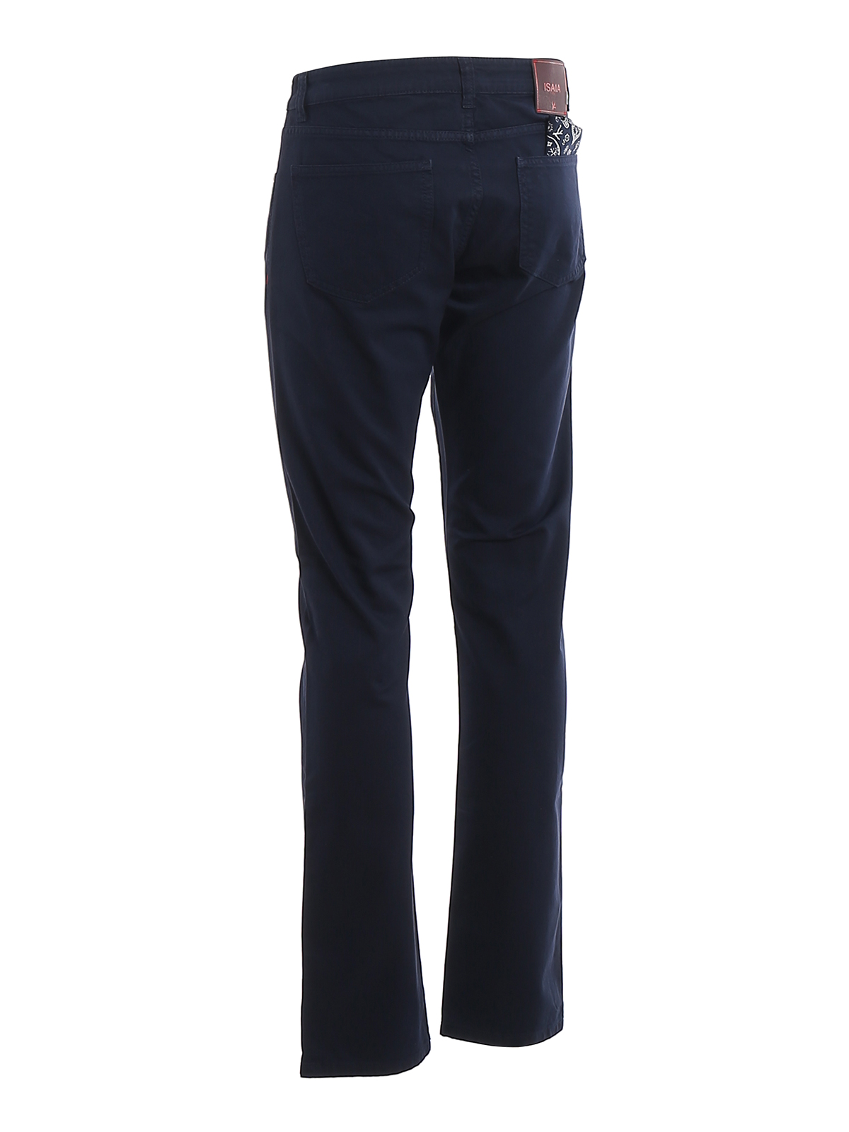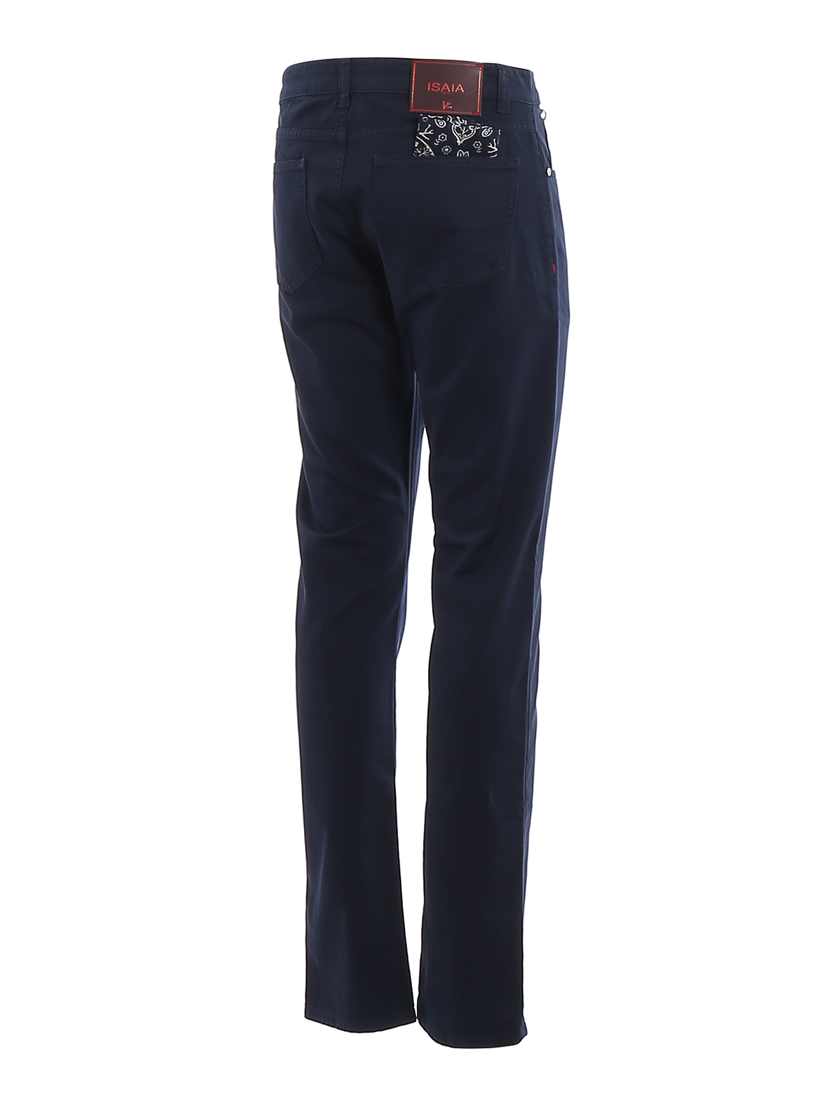 Pantalone Isaia in cotone blu, modello 5 tasche, vestibilità slim fit, chiusura con bottone e zip, pochette blu con fantasia bianca.