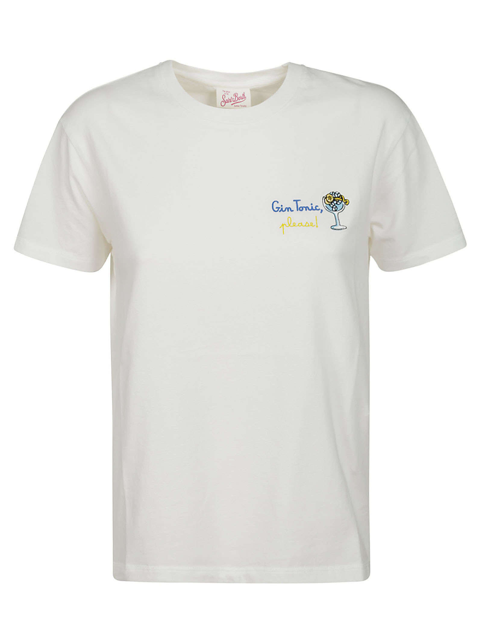 MC2 SAINT BARTH t-shirt a mezza manica in cotone ad unica tinta bianca, con ricamo colorato GIN TONIC azzurro PLEASE in giallo