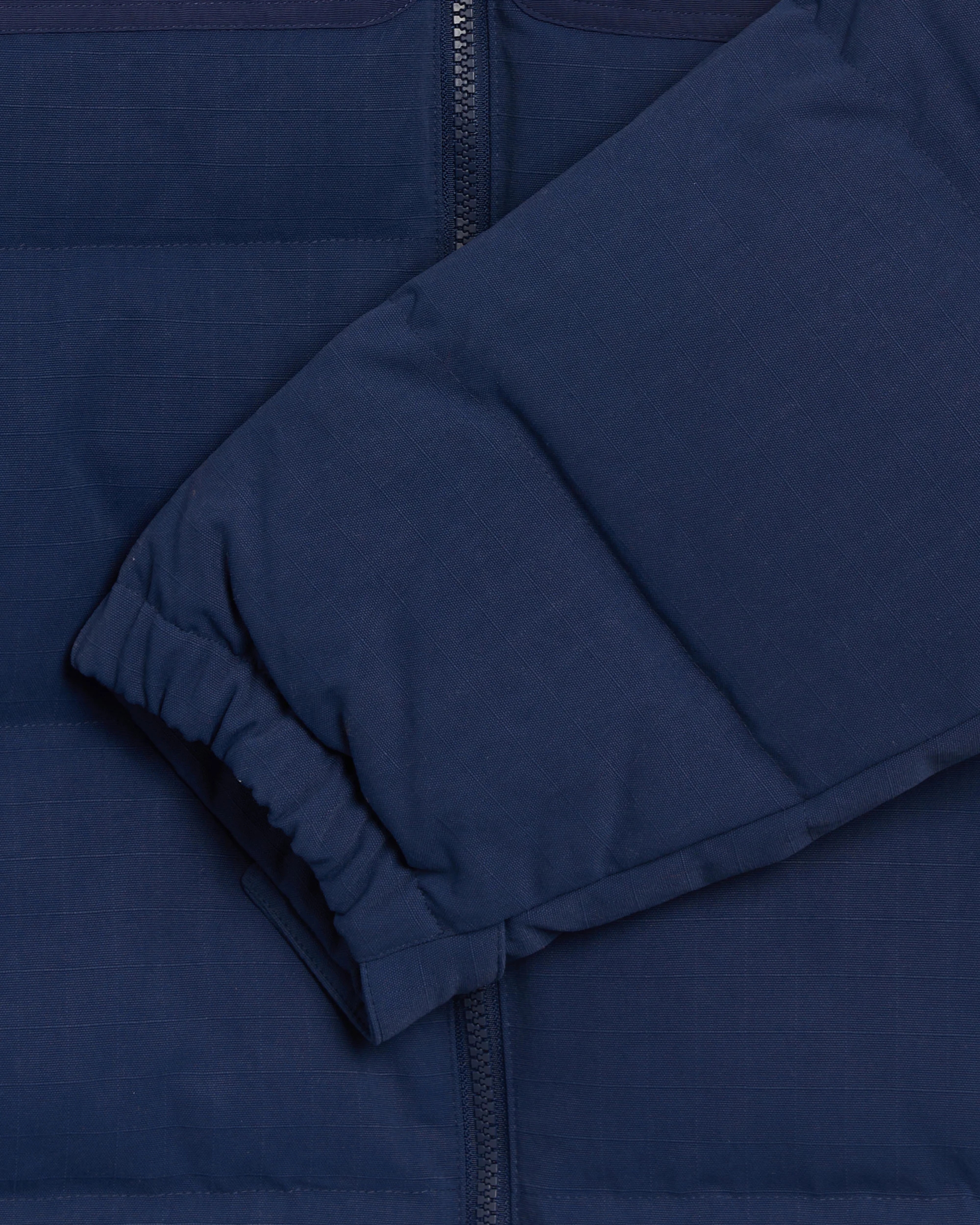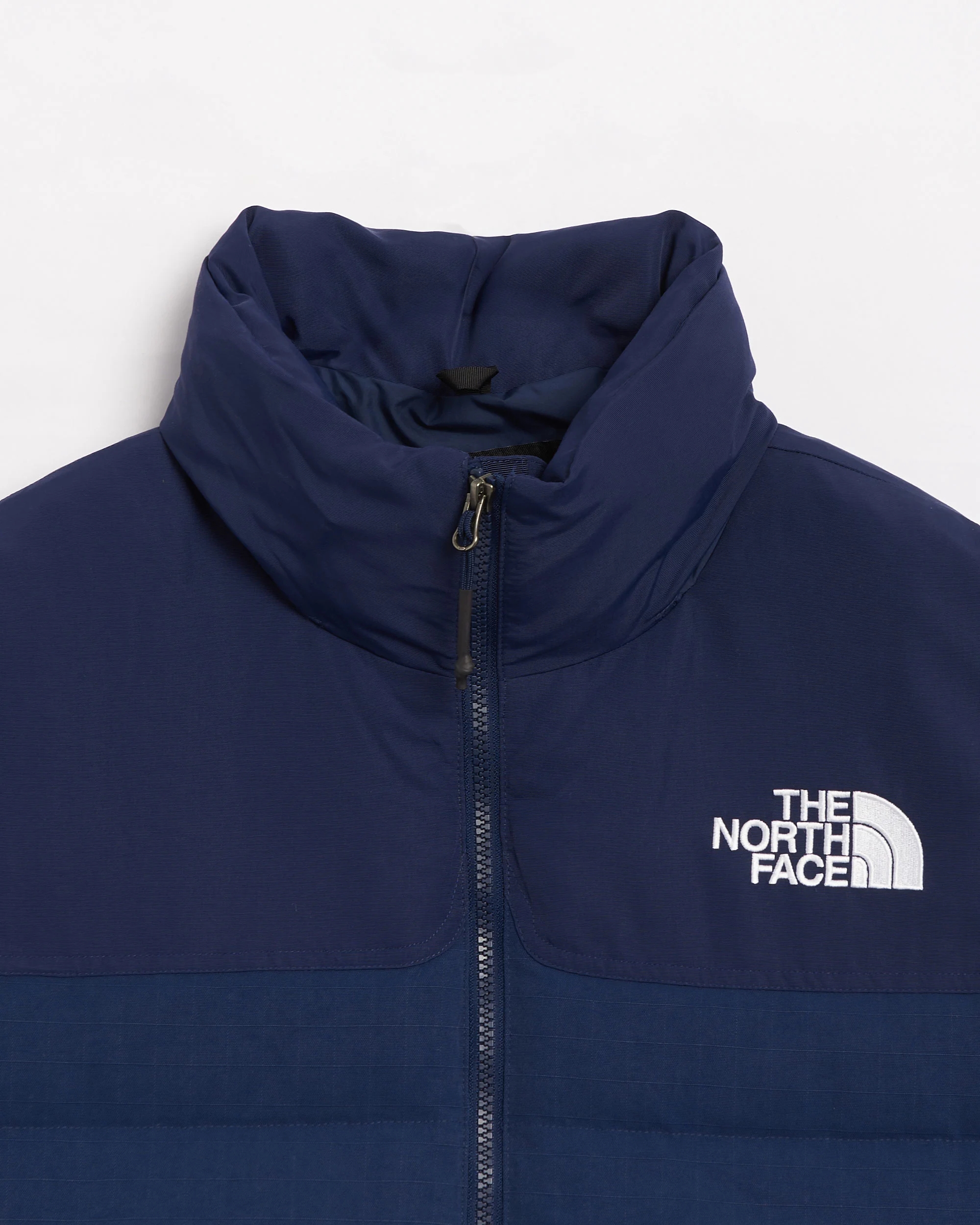 THE NORTH FACE giubbotto imbottito blu, con due tasche frontali e logo bianco laterale.